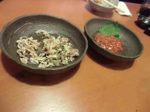 さていよいよ自由注文です 右の方の食べ物は注文した人に責任をとってもらいました、もう一つの豚のなんか?はなんとか この刺身は頼んだ自分が何とか責任を取って、基本的に醤油がもう少し良ければ。 醤油の美味しくない店はそれだけで大体 他の料理が想像…