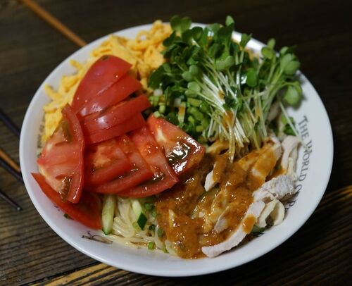 昨日の晩御飯は冷やし中華を作りました。前回は卵が多すぎ位だったので今度は8個。少し鶏ガラスープを入れ味付け錦糸卵(もどき)を作ります。普通は丸めないようですね~丸めても切るときに丸めるようです。量が多いので手抜きです。鶏肉はとりあえず準備。…