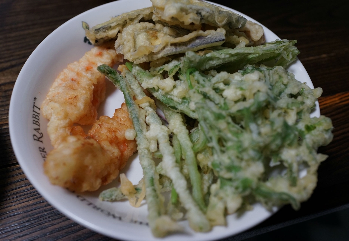 残った野菜は全部自分が。 天つゆ温めてぶっかけました。