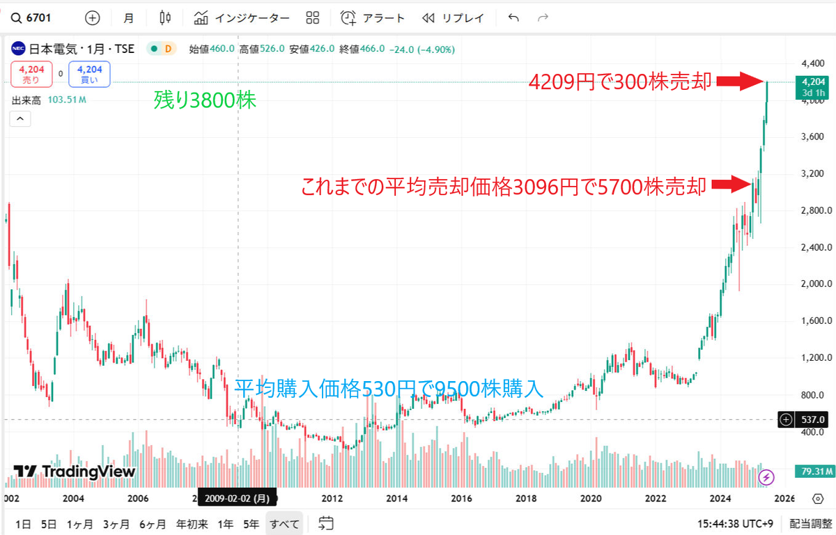 NECを4209円で300株売却 残りは3800株