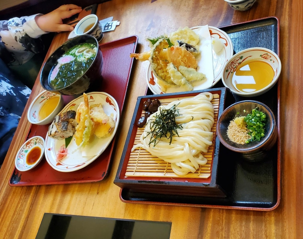 妻は焼きさば寿司定食のわかめうどん、長男は天ざる