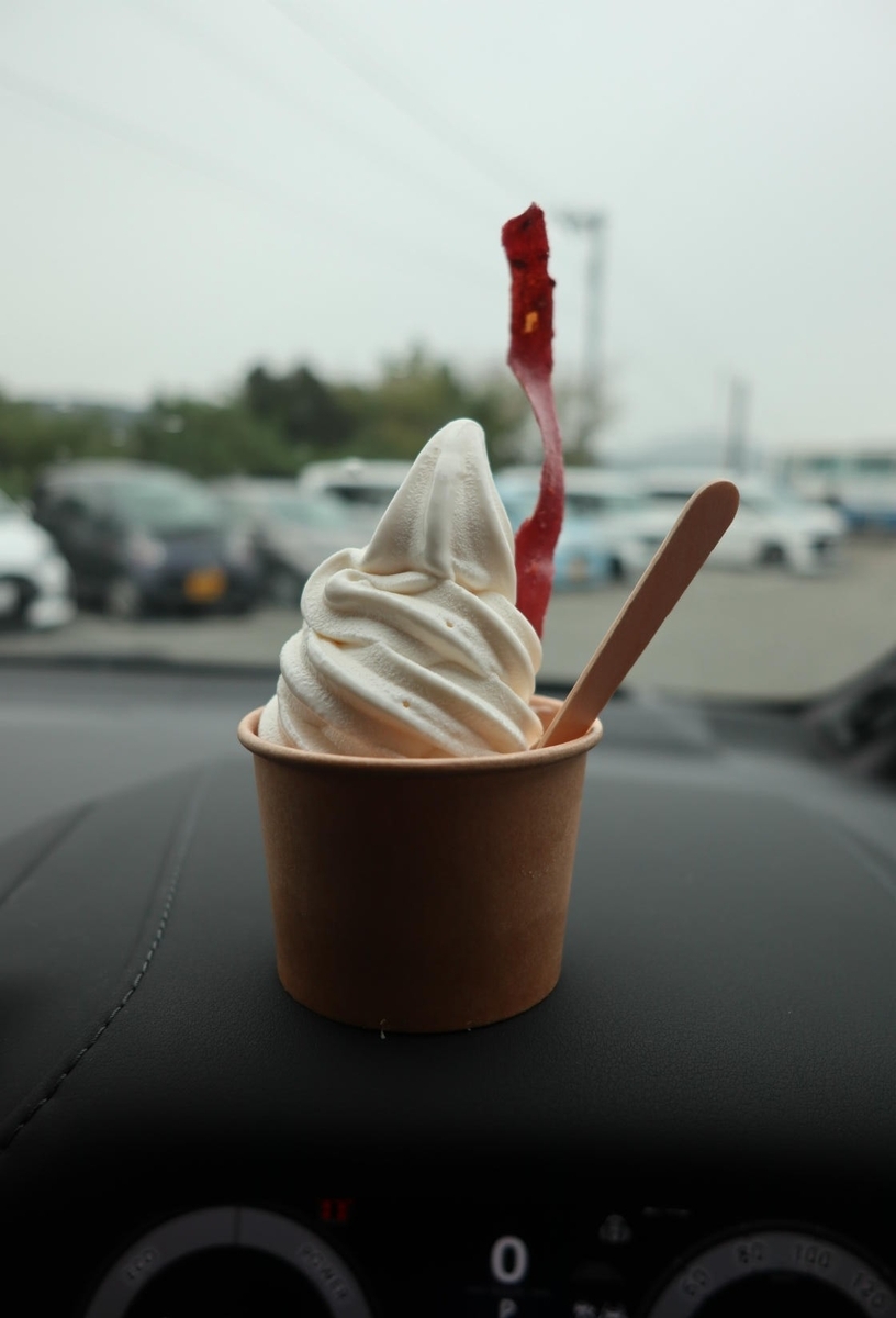 駐車場の近くの売店で芋ソフト購入、ピンクのは焼いた芋の皮